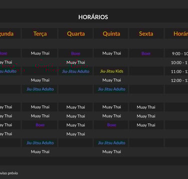 A Academia Nova Arena oferece aulas de Muay Thai, Jiu-Jitsu/Submission, Boxe e Ninjutsu.